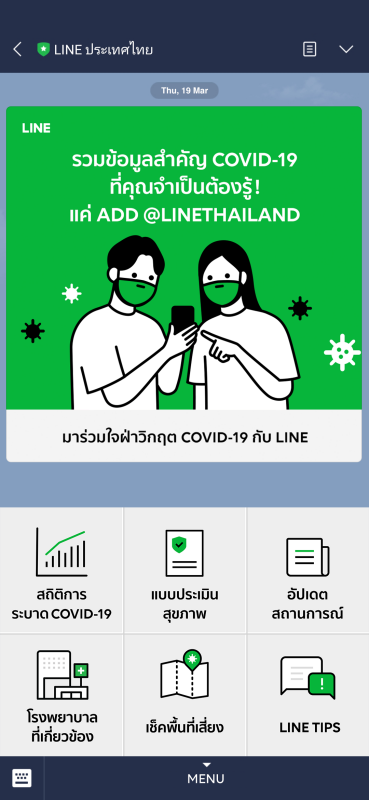 ในช่วงเวลาวิกฤตเช่นนี้ ข้อมูลที่รวดเร็ว ถูกต้อง แม่นยำ เป็นสิ่งที่สำคัญที่สุดที่ทุกคนมองหา LINE ประเทศไทย เจ้าของแพลตฟอร์มที่เข้าถึงคนไทยกว่า 45 ล้านคนทั่วประเทศ อาสาเป็นศูนย์กลางในการรวบรวมข้อมูล ข่าวสาร ความรู้ อัพเดทสถานการณ์ ที่ถูกต้องเชื่อถือได้และรวดเร็ว เปิดตัว โควิด-19 อินโฟ ฮับ มินิแอป หรือ COVID-19 INFO HUB Mini App เมนูบริการใหม่บน “LINE ประเทศไทย Official Account” ที่ให้ข้อมูลเกี่ยวกับสถานการณ์โควิด-19 อย่างครบถ้วน พร้อมพัฒนาเครื่องมือดิจิทัลเพื่อให้ประชาชนสามารถประเมินสุขภาพเบื้องต้นการติดเชื้อโควิด-19 ได้ด้วยตนเอง และยังสามารถเก็บเป็นบันทึกส่วนตัวที่แสดงให้แพทย์ได้วินิจฉัยโรคได้ถูกต้องเมื่อจำเป็นต้องไปโรงพยาบาล