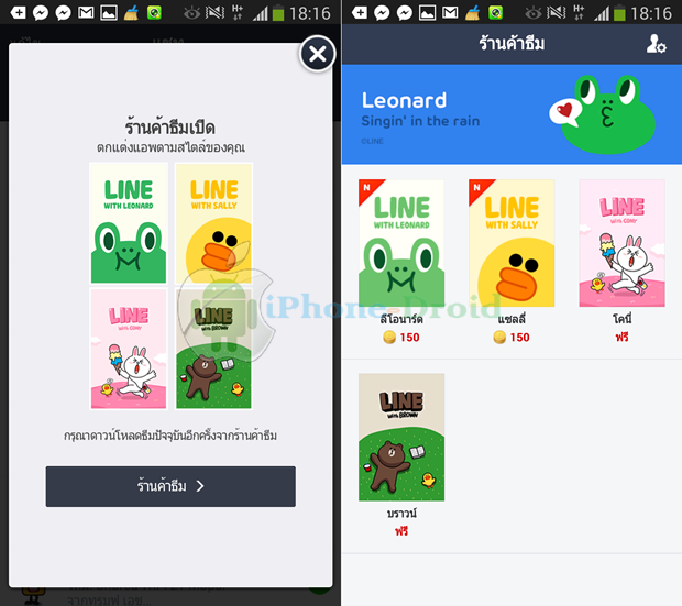 LINE for Android  เวอร์ชั่น 4.0.0 เพิ่มฟีเจอร์ร้านค้าธีม ปัจจุบันมีธีมแบบขาย 2 แบบ ได้แก่ ธีมลีโอนาร์ด และธีมแซลลี่ นอกจากนี้ก็มีธีมแจกฟรี 2 แบบ ได้แก่ ธีมโคนี่ และธีมบราวน์ เพียงเข้าไปที่เมนูอื่น ๆ แล้วเลือกเมนูร้านค้าธีม