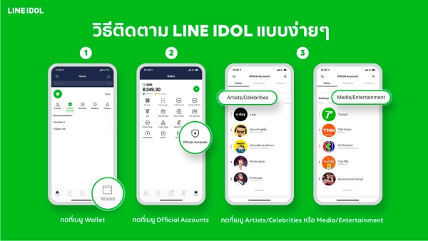ทั้งนี้ นับจากที่เริ่มเปิดทดลองใช้งาน LINE IDOL ตั้งแต่ปีที่ผ่านมา ณ ปัจจุบัน LINE IDOL มีพาร์ทเนอร์กว่า 100 บัญชีรายชื่อแล้ว โดยสามารถแบ่งตามประเภทคอนเทนต์ได้ถึง 9 กลุ่มด้วยกัน ได้แก่ ธุรกิจและการตลาด, ข่าวสารทั่วไป, เทคโนโลยี, ไลฟ์สไตล์, การ์ตูน, กีฬา, บันเทิง, อสังหาริมทรัพย์ และ ครอบครัว ผู้ใช้งานไลน์ สามารถติดตามไอดอลที่ตนเองชื่อชอบได้ ผ่านเมนู Wallet > Official Accounts > Artists & Celebrities หรือ Media/Entertainment