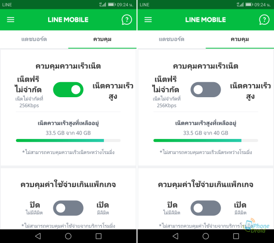 ควบคุมความเร็วเน็ต LINE Mobile สามารถเล่นเน็ตความเร็ว 256Kbps ฟรีได้อย่างไม่จำกัด ซึ่งเป็นจุดเด่นที่น่าสนใจมากๆ เลยครับ ใช้ได้แบบไม่จำกัดจำนวนครั้ง โดยผู้ใช้งานสามารถเข้ามาปรับเปลี่ยนการใช้งานได้เอง อยากเลือกใช้เป็นความเร็วสูงสุดของแพ็กเกจ หรือจะเลือกใช้ 256Kbps ก็สามารถทำได้เองตลอดเวลาที่ต้องการ เรียกได้ว่าสะดวกมากๆ ครับ ทำได้เองตลอด 24 ชม. ตามต้องการ