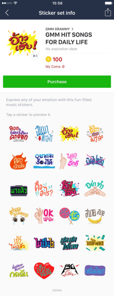 ล่าสุด “มิวสิคสติกเกอร์ (Music Sticker)” ครั้งแรกของสติกเกอร์ที่มาพร้อมเสียงเพลงความยาวสูงสุด 8 วินาที ที่จะเปลี่ยนแชตธรรมดาๆ ให้มีชีวิตชีวามากขึ้น โดยมิวสิคสติกเกอร์ เชตแรกที่เปิดตัวในประเทศไทย LINE ได้จับมือกับพันธมิตรยักษ์ใหญ่วงการเพลงอย่างจีเอ็มเอ็ม แกรมมี่ ซึ่งถือเป็นค่ายเพลงที่มีศิลปินที่ได้รับความนิยม และมีเพลงฮิตติดปากคนไทยจำนวนมาก โดยได้นำท่อนฮุกจากเพลงยอดนิยมทั้งในอดีตและปัจจุบันมาสร้างสรรค์เป็นสติเกอร์แบบพิเศษ เจาะกลุ่มผู้ใช้ทุกเพศทุกวัย ประเดิมเซ็ทแรกด้วยท่อนเพลงฮิตติดปากสำหรับคนทำงานออฟฟิศ ที่คัดสรรมาแล้วว่าโดนใจคนทำงานสุดๆ อาทิ อ้าว เฮ้ย (เพลง ‘อ้าว’ จากอะตอม), ก็ใครมันจะไปรู้ล่ะ (‘ก็ใครมันจะไปรู้ล่ะ’ จาก เจ เจตริน) เหนื่อยไหมสิ่งที่เธอทำอยู่ (‘เหนื่อยไหม’ จากเบิร์ด ธงไชย), เช้าไม่กลัว กลัวไม่เช้า (เพลง ‘เช้าไม่กลัว’ จากลีโอ พุฒ) นั่นแหละคือความกดดัน (‘กดดัน’ จากแอม เสาวลักษณ์) ไปจนถึง ออก อย่างนี้ต้องลาออก (เพลง ‘ลาออก’ จากบิลลี่ โอแกน) และอื่นๆ อีก ไม่ว่าจะอารมณ์ไหนก็แชตได้ง่ายๆ แค่กดสติกเกอร์ส่งในคลิกเดียว