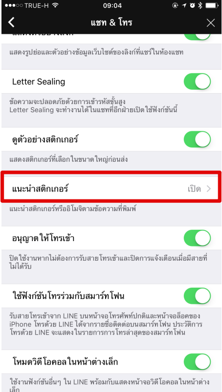 แต่ถ้าพิมพ์แล้วไม่ขึ้น ให้เข้าไปที่ อื่นๆ > การตั้งค่า > แชท & โทร > แนะนำสติกเกอร์ > เปิด
