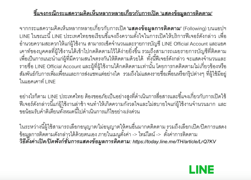 จากกระแสความคิดเห็นหลากหลายกี่ยวกับการเปิด ‘แสดงข้อมูลการติดตาม‘ (Following) บนแอปฯ LINE ในขณะนี้ LINE ประเทศไทยขอเรียนชี้แจงถึงความตั้งใจในการเปิดให้บริการฟีเจอร์ดังกล่าว เพื่ออำนวยความสะดวกให้แก่ผู้ใช้งาน สามารถเช็คจำนวนและรายการบัญชี LINE Official Account และแอคเคาท์ของบุคคลที่ผู้ใช้งานได้เข้าไปกดติดตามไว้ได้ง่ายยิ่งขึ้น รวมถึงสามารถเผยรายการบัญชีที่ติดตามเพื่อเป็นการแนะนำแก่ผู้ที่มีความสนใจตรงกันให้ติดตามด้วยได้ ทั้งนี้พีเจอร์ดังกล่าว จะแสดงจำนวนและรายชื่อ LINE Official Account และผู้ที่ผู้ใช้งานได้กดติดตามเท่านั้น โดยการกดติดตามไม่เกี่ยวข้องหรือสัมพันธ์กับการเพิ่มเพื่อนและการส่งแชทแต่อย่างใด รวมถึงไม่แสดงรายชื่อเพื่อนหรือกรุ๊ปต่างๆ ที่ผู้ใช้มีอยู่ในแอคเคาท์ LINE