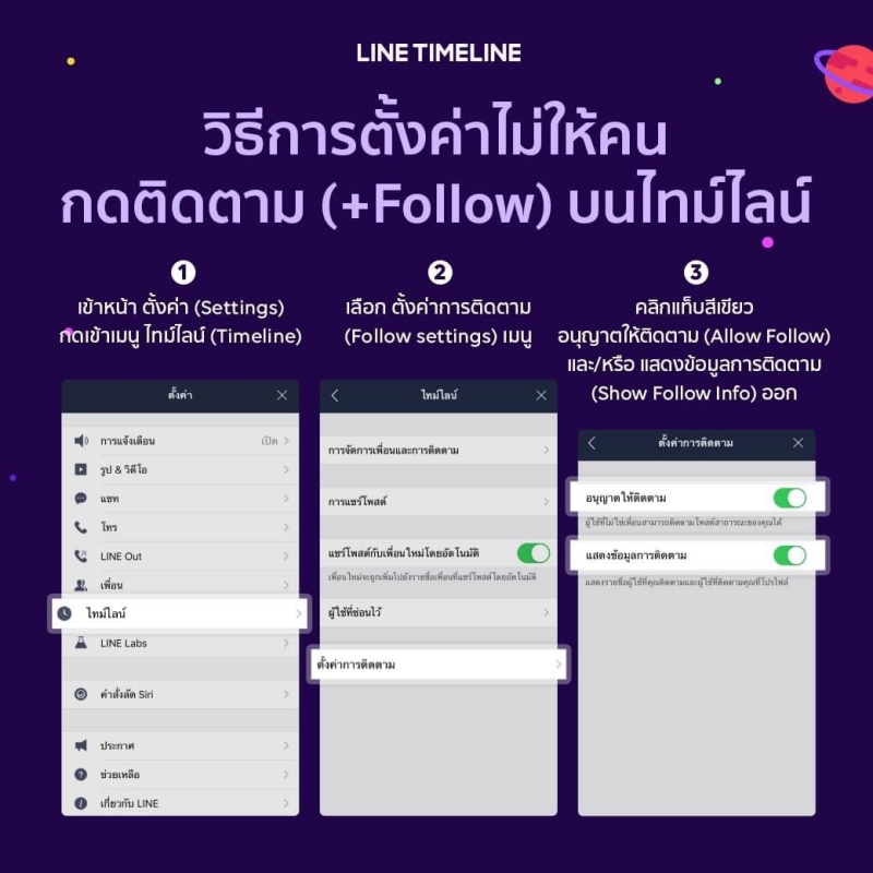 ในระหว่างนี้ผู้ใช้สามารถเลือกอนุญาตไม่อนุญาตให้คนอื่นมากดติดตาม รวมถึงเลือกเปิดปิดการแสดงข้อมูลการติดตามดังกล่าวได้ด้วยตนเอง ภายในมนูตั้งค่า->ไทม์ไลน์-> ตั้งค่าการติดตาม วิธีตั้งค่าเปิดปิดฟังก์ชั่นการแสดงข้อมูลการติตาม: htps:/today line. me /T H/article/Lro7Kv