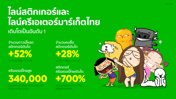 LINE ประเทศไทย สุดปลื้ม!!! ธุรกิจไลน์สติกเกอร์สร้างปรากฏการณ์เติบโตสูงสุด! พบยอดดาวน์โหลดไลน์สติกเกอร์ในไทยไตรมาสแรกของปี 2561 เพิ่มสูงขึ้นถึง52% จากช่วงเวลาเดียวกันของปีที่แล้ว ในขณะที่ตลาด LINE CREATORS MARKET ก็ได้สร้างสถิติใหม่ด้วยจำนวนครีเอเตอร์ที่เพิ่มสูงขึ้นกว่า 200% จากปีที่ผ่านมา รวมแล้วมีจำนวนครีเอเตอร์สติกเกอร์คนไทยแล้ว 340,000 คน พร้อมอัตราการเพิ่มขึ้นของจำนวนไลน์สติกเกอร์ในตลาดที่เพิ่มสูงขึ้นกว่า 7 เท่าจากปีที่ผ่านมา นับได้ว่าเป็นครั้งแรกที่ LINE STICKERS และ LINE CREATORS MARKET ในไทย มีการเติบโตขึ้นเป็นอันดับ 1 ในปีนี้