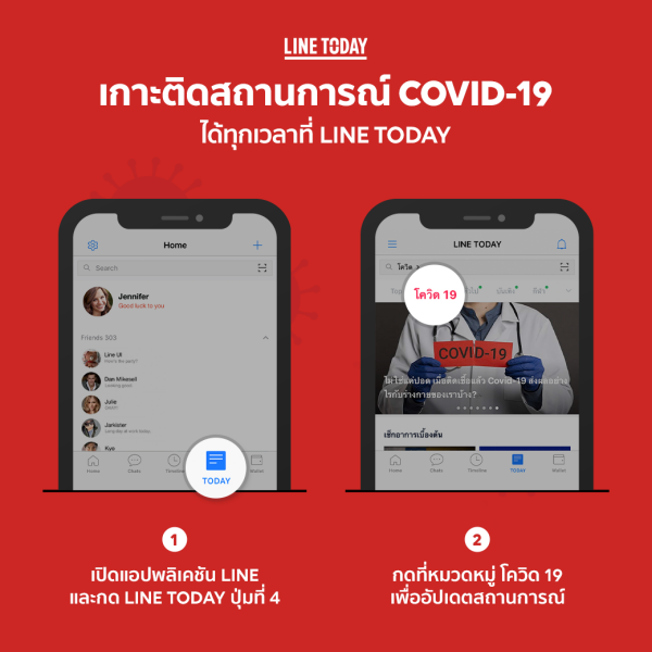 จากสถานการณ์การระบาดของไวรัสโคโรนา 2019 (COVID-19) ที่ขณะนี้เป็นปัญหาครอบคลุมทั่วโลก ซึ่งในประเทศไทยก็มีการแพร่กระจายเป็นวงกว้างมากขึ้น มีจำนวนผู้ติดเชื้อเพิ่มสูงขึ้น ทำให้ต้องมีการติดตามข้อมูลข่าวสารจากแหล่งที่น่าเชื่อถืออยู่อย่างต่อเนื่อง LINE TODAY เป็นช่องทางที่รวบรวมความเคลื่อนไหวจากแหล่งข่าวและแหล่งข้อมูลต่าง ๆ มาโดยตลอด และต่อจากนี้ LINE TODAY ขออำนวยความสะดวก ด้วยการเพิ่มแถบเมนู “โควิด 19” หรือ https://lin.ee/iQ1iRUB/vjky/PR เพื่อการเข้าถึงข้อมูลอย่างสะดวก รวดเร็ว ทันต่อทุกสถานการณ์ เพื่อประสิทธิภาพสูงสุดที่ผู้ใช้ LINE จะรู้เท่าทัน ตลอดจนป้องกันและปรับตัวได้อย่างเหมาะสมในสภาวะปัจจุบัน