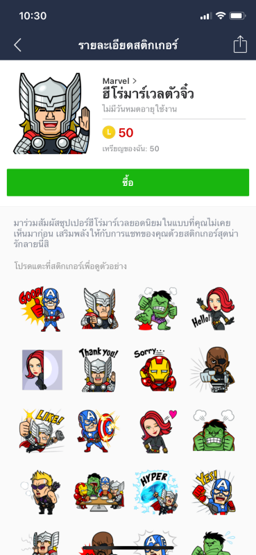 LINE นำสติกเกอร์ และ ธีม จาก MARVEL รวม 6 ชุด ลดราคาพิเศษเอาใจแฟนๆ เหล่าฮีโรของ MARVEL เหลือเพียง 30 บาท (50 เหรียญ) เพื่อเป็นการฉลองภาพยนตร์ล่าสุด ใครทีเป็นแฟน MARVEL และสนใจสามารถดูรายสติกเกอร์ที่นำมาลดราคาแต่ละแบบและคลิกที่ลิงก์เพื่อเข้าไปสั่งซื้อได้ครับ