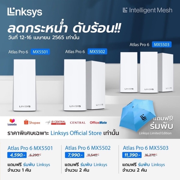 - ️ Atlas Pro 6 MX5501 รับฟรี! ร่มพับ Linksys Limited Edition จำนวน 1 คัน