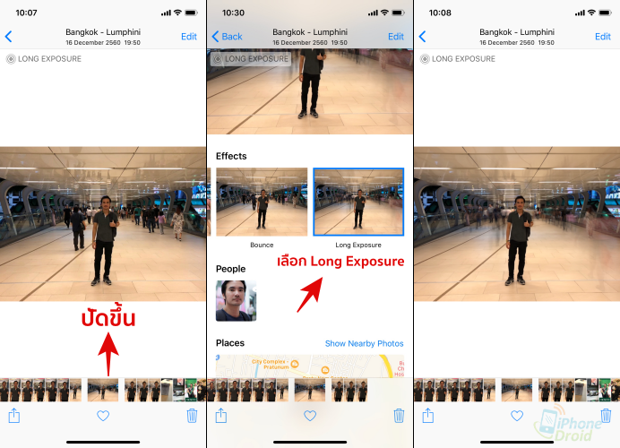 การใช้งานให้เข้าที่ Photo จากนั้นเลือกรูป Live Photo ที่ถ่ายไว้แล้วก่อนหน้านี้ และให้ “ปัดขึ้น” จากรูปที่ต้องการ จะมีให้เลือกอยู่ 4 โหมดด้วยกันครับ Live, Loop, Bounce และ Long Exposure ให้เลือกที่ Long Exposure เพื่อใช้งานครับ