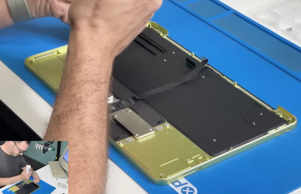 ทั้งนี้ การเปิดตัวเครื่องอะลูมิเนียม ต้องคลายสกรู 8 ตัวที่ด้านล่าง คล้ายกับ MacBook Air และ MacBook Pro โดยภายในจะพบเมนบอร์ดขนาดเล็กที่ล้อมรอบด้วยการจัดวางภายในที่เรียบง่าย มีชิ้นส่วนน้อยที่สุด และไม่มีฝาครอบบานพับ ด้านแบตเตอรี่ถูกยึดด้วยสกรู 18 ตัว สามารถยกออกมาตรงๆ ได้ โดยไม่มีแถบกาวหรือกาวเหนียวยึดไว้ด้วย ซึ่งจริงๆ แล้ว ระหว่างการถอดประกอบก็ไม่พบเทปใดๆ เลยด้วย ถือเป็นครั้งแรกสำหรับ Mac รุ่นใหม่ๆ