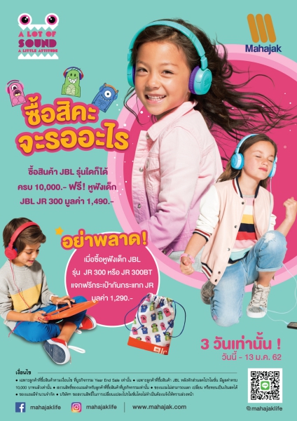 บริษัท มหาจักรดีเวลอปเมนท์ จำกัด จัดโปรเอาใจแม่ โดนใจลูก! เมื่อซื้อ JBL รุ่นใดก็ได้ ครบ 10,000 บาท ฟรี! หูฟังเด็ก JBL JR 300 มูลค่า 1,490 บาท และ เมื่อซื้อหูฟังเด็ก JBL  รุ่น JR 300 หรือ JR 300BT แจกกระเป๋ากันกระแทก JR มูลค่า 1,290 บาท เริ่มแล้ว ตั้งแต่วันวันนี้ – 13 ..62 นี้ เฉพาะบูธที่มีกิจกรรมเท่านั้น ดูรายละเอียดเพิ่มเติมที่ bit.ly/2QyVgQg