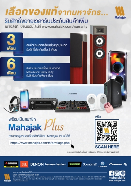 บริษัท มหาจักรดีเวลอปเมนท์ จำกัด ขอมอบสิทธิพิเศษจากมหาจักรฯ เพื่อลูกค้าคนพิเศษของเรา มอบความพิเศษนี้ให้ลูกค้ามหาจักรฯ ทุกท่านกับ Mahajak Plus เพียงซื้อสินค้าของบริษัทมหาจักรฯ ทุกชนิดไม่ว่าจะเป็น แอร์ฯ Mitsubishi Heavy Duty เครื่องเสียง JBL, DENON, Harman Kardon, SHURE, Soundcraft, Crown ,Pioneer DJ