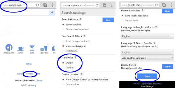 Handwrite คือคุณลักษณะการค้นหาคำจากการเขียนด้วยมือของเรา เพียงเข้าไปที่ www.google.com ผ่านเบราวซ์เซอร์บนมือถือ สำหรับประเทศไทยให้ทำการเปลี่ยนภาษาให้เป็นภาษาอังกฤษก่อน แล้วแตะที่เมนู Settings แล้วติ๊กที่ Enable ในส่วนของ Handwrite ? แล้วบันทึกการตั้งค่า