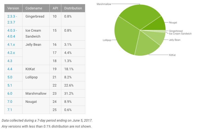 Google เผยสัดส่วนระบบปฏิบัติการเวอร์ชั่นต่างๆ โดยเวอร์ชั่นล่าสุดอย่าง Nougat มีสัดส่วนการติดตั้งใช้งานบนอุปกรณ์ Android แล้วกว่า 9.5% ซึ่งเป็นตัวเลขที่รวมทั้ง Android 7.0 – 7.1