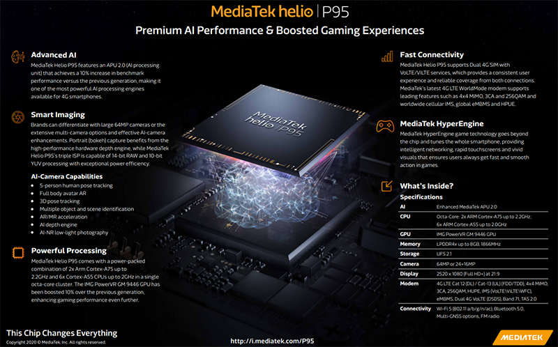 Helio P95 ยังรองรับ RAM สูงสุด 8GB LPDDR4X และ UFS 2.1 โดยตัวกล้องรองรับมากสุดที่ 64 ล้านพิกเซล หรือ 24 + 16 ล้านพิกเซล ขณะที่หน้าจอรองรับความละเอียด 2520 x 1080 พิกเซล อัตราส่วน 21:9 ทั้งนี้ หน่วยประมวลผลยังรองรับ APU 2.0 หรือ AI Processor Unit ที่ให้ความฉลาดของ AI มากขึ้นประมาณ 10%
