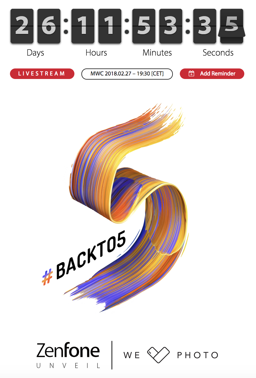 ASUS เปิดหน้าเว็บเพจเพื่อนับถอยหลังเข้าสู่งานเปิดตัว Zenfone 5 Series สมาร์ทโฟนรุ่นใหม่ของปีนี้ในงาน MWC 2018 เมืองบาร์เซโลน่า ประเทศสเปน โดยมีเพียงภาพตัวเลข 5 หลากสีสันที่เป็นการใช้แปรงระบายสีเขียนขึ้นมา พร้อมข้อความติดแฮชแท็ก #Backto5 และดูเหมือนว่าจะยังคงเน้นชูจุดเด่นด้านกล้องถ่ายรูปเพื่อจุดขายภายใต้สโลแกน We Love Photo