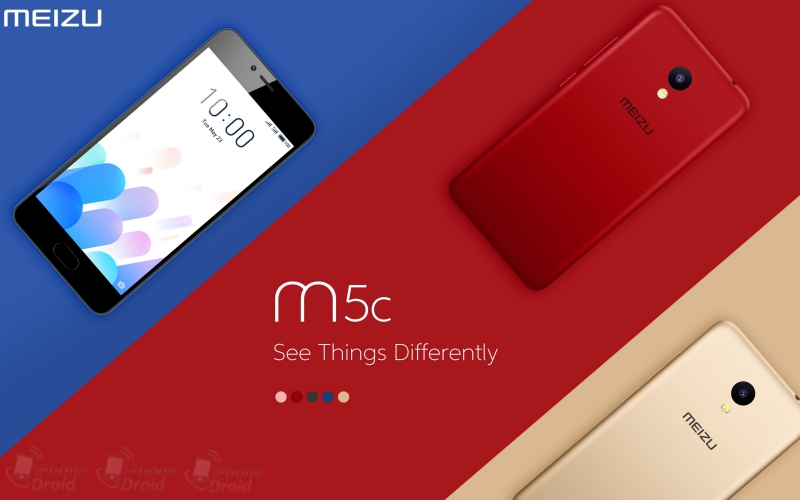 Meizu M5c มีให้เลือก 5 สี ได้แก่ สีดำ สีทอง สีแดง สีฟ้า และสีชมพู ตัวเครื่องหนัก 135 กรัม และหนา 8.3 มิลลิเมตร มาพร้อมหน้าจอแสดงผลขนาด 5 นิ้ว HD 720p ซีพียู Quad-core 1.3GHz กับแรม 2GB กล้องหน้าความละเอียด 5 ล้านพิกเซล เซลฟี่หน้าสวยด้วย ArcSoft และกล้องหลังความละเอียด 8 ล้านพิกเซล ค่ารูรับแสง f/2.0