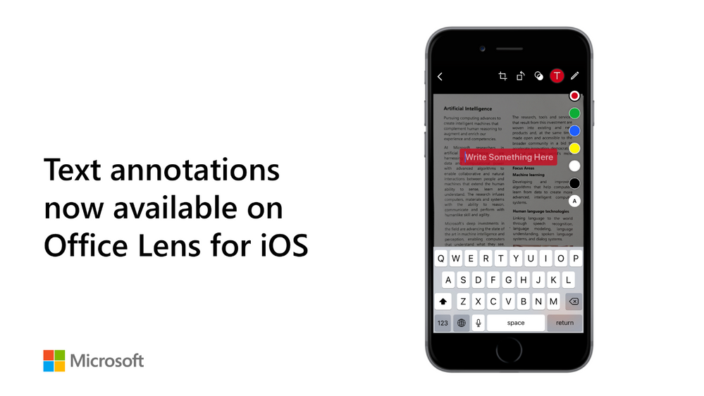 ในระบบ iOS จะมีการเพิ่มคุณลักษณะเพิ่มอย่างเดียวก็คือ “คำอธิบายประกอบแบบข้อความ(text annotations)” คุณลักษณะนี้ก็มีใช้งานในระบบ Android มาซักระยะหนึ่งแล้ว โดยพื้นฐานการใช้งานแล้วผู้ใช้งานในระบบ iOS จะสามารถใส่รูปภาพประกอบและรูปแบบข้อความ พร้อมกับสีที่แตกต่างกันได้หลังจากที่ได้รับการบันทึกด้วย Office Lens