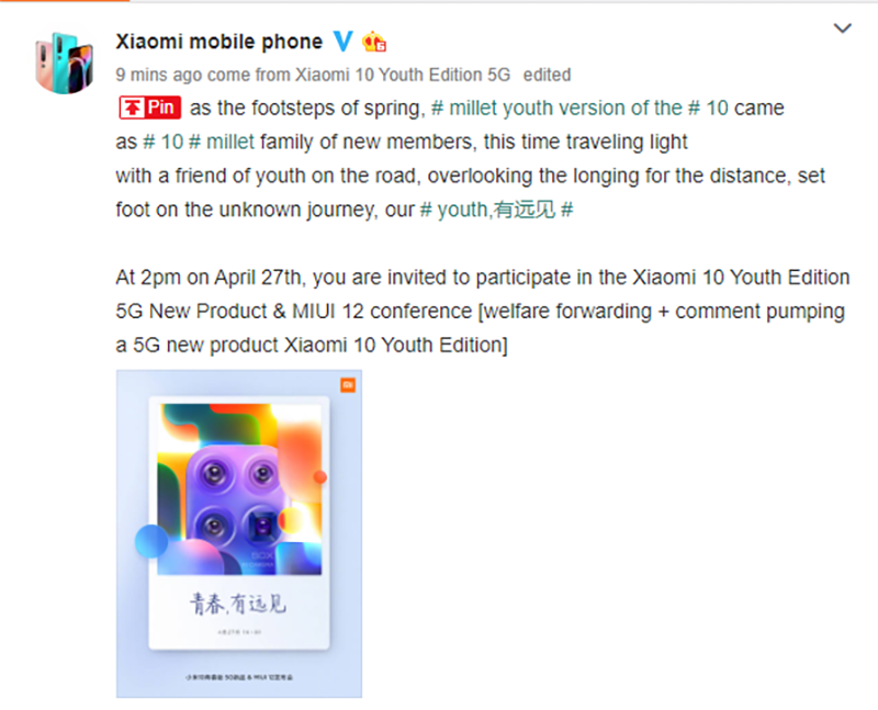 Xiaomi ประกาศผ่านบัญชี Weibo ของตัวเองเป็นที่เรียบร้อยแล้วว่าเตรียมที่จะเปิดตัว ในวันที่ 23 เมษายนนี้ ควบคู่กับ Mi 10 Lite Youth Edition ที่ประเทศจีนด้วย