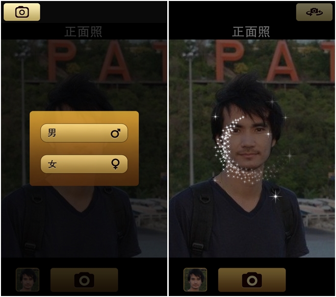 หลังจากที่โหลดแอพมาติดตั้งเรียบร้อยแล้วมาเริ่มทำภาพกันดีกว่าครับ สำหรับภาพที่เราจะนำมาทำนั้น สามารถเลือกได้ทั้งจากในอัลบั้มภาพ และถ่ายภาพใหม่นะครับ ถ้าภาพที่เลือกมาแล้วลูกตาและปากไม่ตรงกับตำแหน่งที่แอพกำหนดมาสามารถขยับเพื่อให้ตรงได้ก่อนนะครับ ส่วนตัวอย่างภาพนี้ตรงแล้วเลยไม่ขึ้นมาให้ปรับเลือกด้านบนสำหรับผู้ชาย และด้านล่างภาพผู้หญิงนะครับ