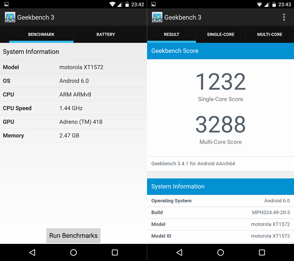 ผลการทดสอบด้วย Geekbench 3 เพื่อทดสอบประสิทธิภาพการทำงานและการประมวลผลและหน่วยความจำแรม การทดสอบนี้จะทำการประมวลออกมาเป็นตัวเลขแบ่งออกเป็น 2 แบบคือ Single-Core และ Multi-Core หากได้คะแนนยิ่งสูงประสิทธิภาพการทำงานจะยิ่งดี โดยผลทดสอบของ Moto X Style ทำคะแนน Single-Core ได้ 1,232 คะแนนถือว่าอยู่ในระดับที่ค่อนข้างดีมาก และ Multi-Core ทำได้ 3,288 คะแนน ใกล้เคียงกับเรือธงรุ่นใหม่หลายรุ่นที่เปิดในปี 2016