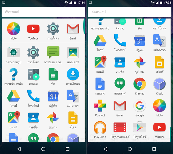 App Drawer จะจัดเรียงแบบหน้าเดียวยาวลงไปด้านล่าง ใช้การเลื่อนขึ้น-ลงเพื่อดูรายการถัดไป โดยบริเวณแถบด้านบนจะมีช่องสำหรับค้นหา และรายการแอพพลิเคชั่นที่เปิดใช้งานล่าสุด และแอพพลิเคชั่นที่ติดตั้งมากับเครื่องส่วนใหญ่จะเป็นของ Google App และแอพพลิเคชั่นของตัวระบบ โดยมีของ Moto อยู่ 2 แอพ ได้แก่ Moto และ Connect
