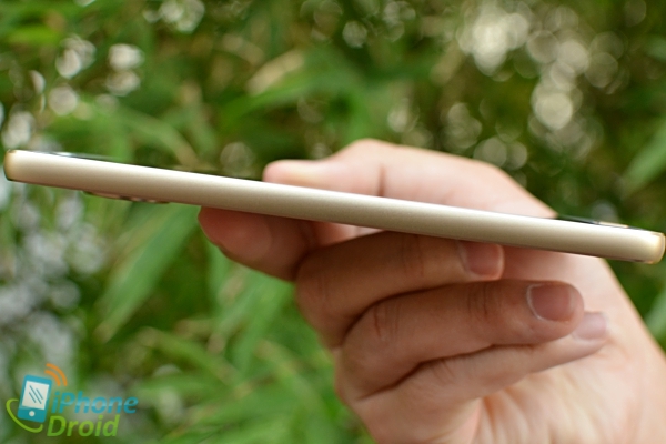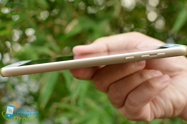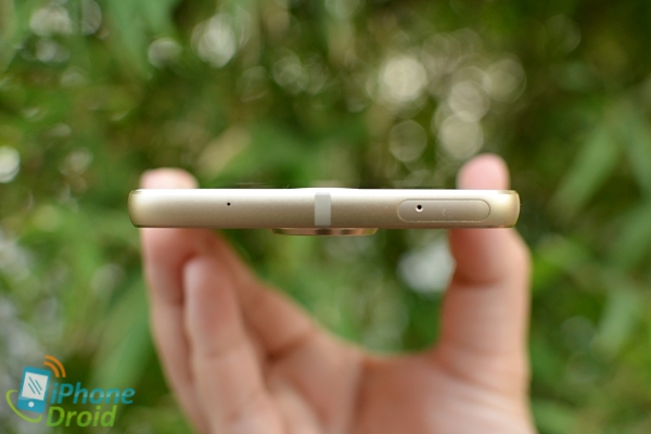 ด้านหลังตัวเครื่องเป็นกระจกกันรอย และจะเห็นว่าในส่วนของโมดูลกล้องจะนูนขึ้นมาเหนือฝาหนังค่อนข้างเยอะ แต่จริง ๆ แล้วรุ่นนี้เมื่อใส่เคสก็จะพอดีกับส่วนที่นูนขึ้นนี้ (ในกล่องจะมีฝาหลังไม้แถมมาให้ฟรี) โดยตัวกล้องหลังมีความละเอียด 16 ล้านพิกเซล มีเลเซอร์ช่วยโฟกัส และแฟลช Dual tone