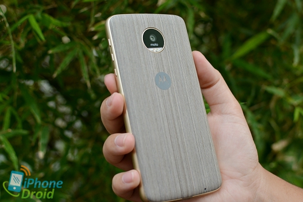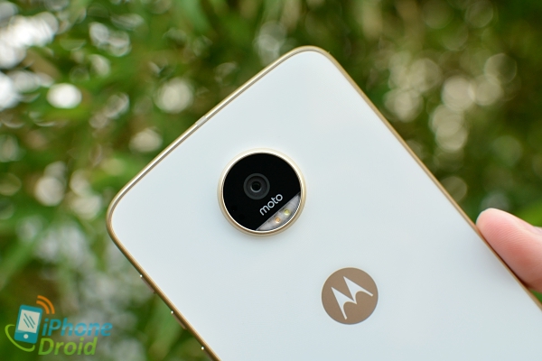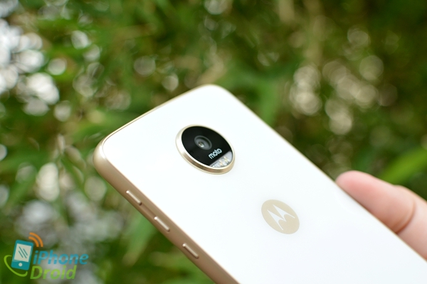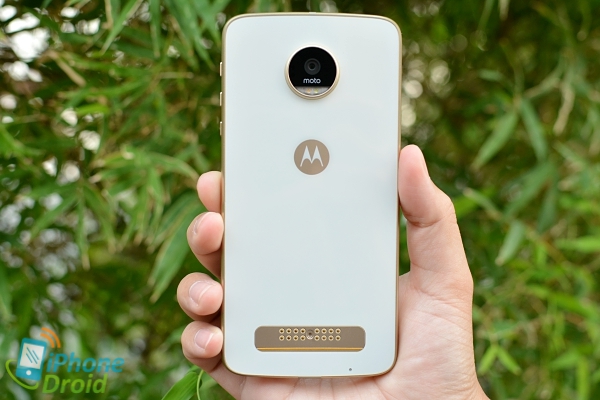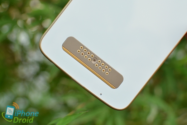 บริเวณส่วนล่างของด้านหลังจะมีจุดเชื่อมต่อสำหรับอุปกรณ์เสริม Moto Mods ซึ่งจะมีวางขายแยกให้ซื้อมาใช้งานร่วมกันได้