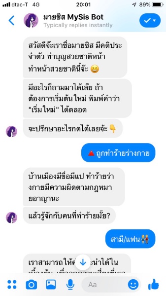 สำหรับผู้ประสบปัญหาความรุนแรงในครอบครัว สามารถเข้ามาใช้งาน My Sis โดยปรึกษาผ่าน Facebook Messenger “มายซิส My Sis bot”  http://m.me/mysisbot