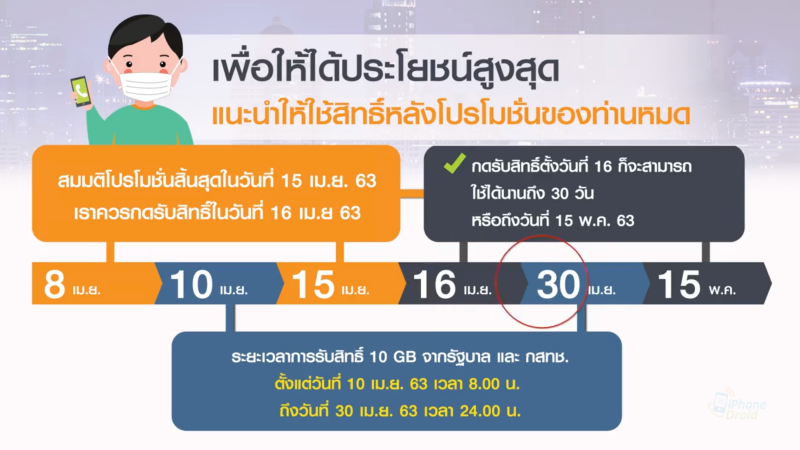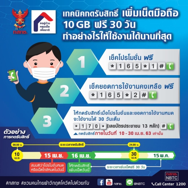 ชาชน 13 หลัก# แล้วกดโทรออก (เฉพาะเบอร์เดิมที่ลงทะเบียนก่อน 31 มีนาคม 2563) หลังจากได้รับ SMS ยืนยันการรับสิทธิ์ ซึ่งจะสามารถใช้งานได้นาน 30 วัน - รับสิทธิ์ได้ตั้ง