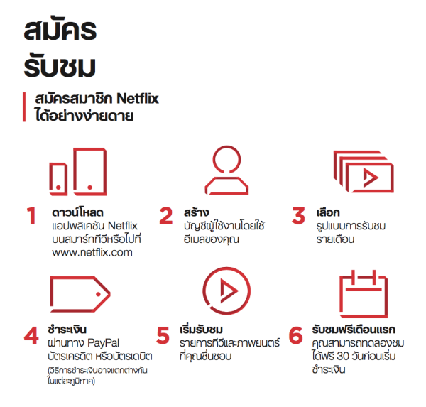 Netflix เปิดโอกาสให้ทดลองใช้บริการฟรีในเดือนแรกและค่าสมาชิกรายเดือนสาหรับเดือนต่อมาเริ่มต้นเพียง 280 บาท สมาชิกของ Netflix สามารถเพลิดเพลินไปกับรายการทีวีและภาพยนตร์ต่างๆ มากมาย ตั้งแต่รายการที่ สร้างสรรค์โดย Netflix ซึ่งได้รับการยอมรับอย่างแพร่หลาย อาทิ สเตรนเจอร์ ธิงส์ (Stranger Things) และ ออ เรนจ์ อีส เดอะ นิว แบล็ค (Orange is the New Black) ไปจนถึงซีรีส์และภาพยนตร์สัญชาติอเมริกัน ยุโรป และ เอเชีย รวมถึงสารคดีและรายการสาหรับเด็กอีกมากมาย นอกจากนีร้ ายการและภาพยนตร์ใหม่ๆ ที่สร้างสรรค์โดย Netflix ยังเปิดตัวให้รับชมทุกตอนทั้งซีซันพร้อมกันทั่วโลกในรูปแบบภาษาไทยให้มากขึ้น