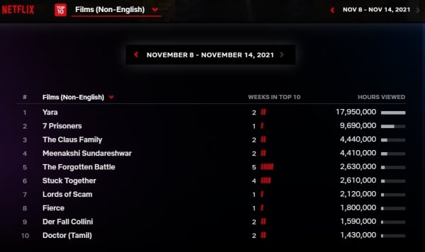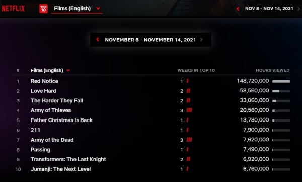 ทุกวันอังคาร เราจะเปิดเผยรายละเอียดเกี่ยวกับ “Top 10 on Netflix” โดยเก็บสถิติจากจำนวนชั่วโมงที่สมาชิกใช้เวลาดูรายการต่าง ๆ จากวันจันทร์ถึงวันอาทิตย์ในสัปดาห์ก่อน ทั้งในส่วนภาพยนตร์และรายการที่ผลิตเพื่อฉายทาง Netflix โดยเฉพาะและที่เราซื้อลิขสิทธิ์มาฉาย เราแยกย่อยสถิติเป็นดังนี้: 10 อันดับยอดนิยมจากคนดูทั่วโลกในประเภทภาพยนตร์ (ภาษาอังกฤษ) รายการทีวี (ภาษาอังกฤษ) ภาพยนตร์ (ภาษาอื่น ๆ ) รายการทีวี (ภาษาอื่น ๆ ) รวมทั้ง 10 อันดับจากตลาดต่าง ๆ มากกว่า 90 ประเทศ นอกจากนี้ เรายังจัดอันดับยอดนิยมสูงสุดสำหรบภาพยนตร์หรือรายการในแต่ละประเภท