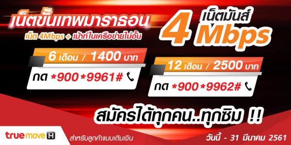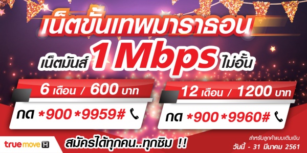 ทรูมูฟ เอช แบบเติมเงิน หยิบโปรแรงมาเสิร์ฟอีกครั้ง กับแพ็กเกจเน็ตขั้นเทพมาราธอน เน็ตมันส์ 1Mbps ไม่อั้น รอบนี้สมัครได้ทุกคน ทุกซิมเติมเงินของทรูมูฟ เอช เล่นเน็ตมันส์ ไม่อั้น 6 เดือน และ 12 เดือน คุ้มยาวๆ ตกเดือนละร้อยเดียว