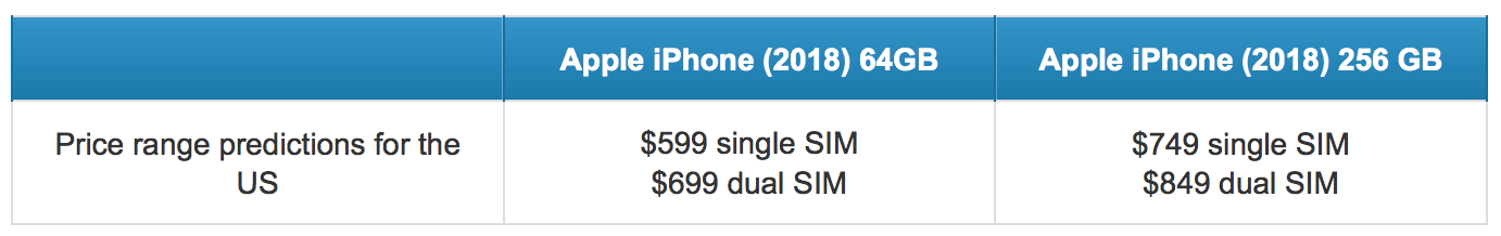 ทั้ง 3 รุ่นนี้จะมีราคาที่แตกต่างกันออกไปในแต่ละรุ่น รุ่นที่มีราคาต่ำที่สุดก็คือ iPhone 9 ที่น่าจะเปิดตัวด้วยราคา 700 เหรียญ (ประมาณ 23,000 บาท) และรุ่นกลาง iPhone X จะเปิดตัวด้วยราคา 800 เหรียญ รุ่นสุดท้ายและเป็นรุ่นที่มีราคาแพงที่สุด iPhone X Plus จะเปิดตัวด้วยราคา 900 เหรียญ