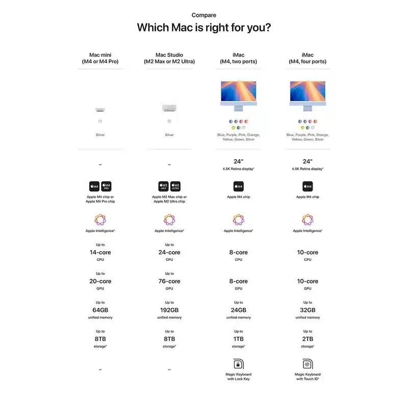 บนหน้าเว็บ Amazon มีการเปรียบเทียบสเปคระหว่าง iMac ชิป M4 และ Mac mini รุ่นใหม่ด้วย ซึ่งเผยให้เห็นถึงการมีชิป M4 และ M4 Pro พร้อมมี CPU สูงสุด 14 คอร์ + GPU สูงสุด 20 คอร์ ทั้งยังมีตัวเลือก RAM สูงสุดถึง 64GB เพิ่มขึ้นจากรุ่นเดิมที่ให้มาสูงสุด 32GB ครับ ขณะที่ความจุก็สามารถเลือกได้มากถึง 8TB เหมือนรุ่นที่แล้ว