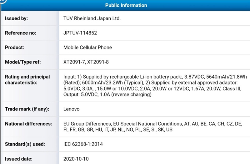 มีแววว่า Motorola เตรียมที่จะเปิดตัวสมาร์ทโฟนอีกรุ่นที่มาพร้อมแบตเตอรี่ความจุถึง 6000mAh หลังจากที่ผ่านการรับรองจาก FCC, EEC และ TUV Rheinland โดยในรุ่นใหม่นี้มีถึง 4 โมเดล ได้แก่ XT2091, XT2091-3, XT2091-4 และ XT2091-7 ขณะที่โมเดลที่ 5 เป็น XT2091-8 ที่ใช้แบรนด์ของ Lenovo