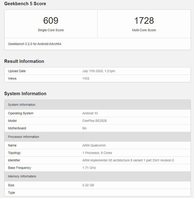 โดยโมเดล BE2028 นั้นตรงกับรุ่นของ OnePlus ที่ปรากฏบน Geekbench ที่ใช้หน่วยประมวลผล Snapdragon 690, RAM 6GB และรันบน Android 10 ด้วย ซึ่งเราอาจจะได้เห็นรุ่นนี้พร้อมๆ กับ OnePlus 8T Series ในช่วงเดือนกันยายนครับ