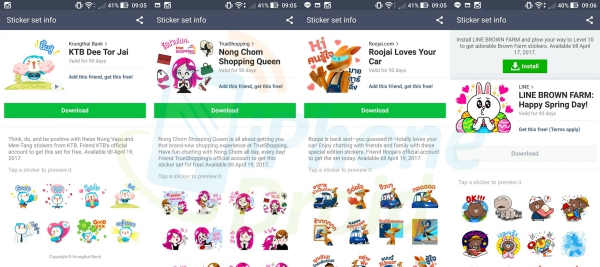 - LINE BROWN FARM: Happy Spring Day! (http://line.me/R/shop/detail/8214) สติกเกอร์จากเกม LINE BROWN FARM ดาวน์โหลดเกมมาแล้วเล่นให้ถึงเลเวล 10 ก็ดาวน์โหลดสติกเกอร์ชุดนี้ไปใช้งานกันได้ฟรี ๆ