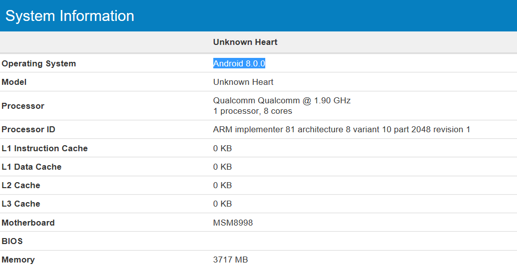 มีการเปิดเผยข้อมูลการทดสอบสมาร์ทโฟนรุ่นลึกลับจาก Nokia ในชื่อรุ่นโมเดล Unknown Heart บนฐานข้อมูลของ Geekbench โดยมาพร้อมชิปเซ็ต Snapdragon 835 และแรม 4GB ซึ่งรันระบบปฏิบัติการ Android 8.0.0 หรือ Android O ที่ออกอัปเดทในเวอร์ชั่นสำหรับนักพัฒนาในตอนนี้นั่นเอง