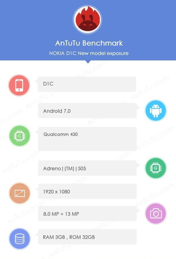 ตามภาพข้อมูลจาก AnTuTu บอกว่า Nokia D1C รันระบบปฏิบัติการ Android 7.0 Nougat ใช้ชิปเซ็ต Snapdragon 430 กับจีพียู Adreno 505 และแรม 3GB ส่วนความจำภายในตัวเครื่องขนาด 32GB