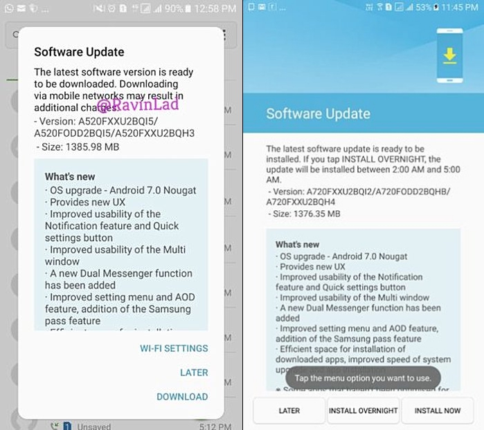 เริ่มทยอยออกอัปเดทไปยังสมาร์ทโฟนระดับกลางแล้วสำหรับ Samsung โดยล่าสุดถึงคิว Galaxy A5 (2017) และ A7 (2017) ที่ได้อัปเดท Android 7.0 Nougat เป็นเฟิร์มแวร์เวอร์ชั่น A520FXXUBQI5 และ A720FXXU2BQI2 ตามลำดับ ซึ่งมาพร้อมการเปลี่ยนแปลงหน้าตาอินเตอร์เฟซหรือ UI ใหม่ และปรับปรุงการทำงานในส่วนของแผง Quick Settings และ Always On Display