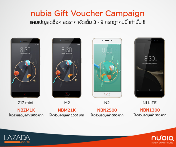 นูเบียสมาร์ทโฟนร่วมแคมเปญครั้งใหญ่กับลาซาด้า Lazada BigDeal มอบโค๊ดส่วนลดให้กับลูกค้าสำหรับซื้อสมาร์ทโฟนนูเบียหลากหลายรุ่น ดังต่อไปนี้