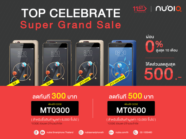 ไม่เพียงช่องทางลาซาด้าเท่านั้น นูเบียยังได้ร่วมกับ 11Street จัดโปรโมชั่นมาให้เพียงใส่โค้ดส่วนลดสุดคุ้มสูงสุด 500 บาท พร้อมโปรผ่อน 0% สูงสุด 10 เดือน เฉพาะรุ่น N2, M2, Z17mini ตั้งแต่ วันนี้ – 15 ธ.ค. นี้ สำหรับท่านใดที่มองหาของขวัญต้อนรับปีใหม่ให้กับคนพิเศษ เรามั่นใจว่าสมาร์ทโฟนนูเบียจะเป็นของขวัญที่ถูกใจผู้รับอย่างแน่นอน www.lazada.co.th/nubia/