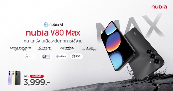 nubia แบรนด์สมาร์ตโฟนระดับโลก ประกาศเปิดตัวสมาร์ตโฟน nubia V80 Series อย่างเป็นทางการในประเทศไทย เผยโฉมกลุ่มผลิตภัณฑ์นวัตกรรมล่าสุด นำโดย V80 Pro, V80 Design และ V80 Max ที่ถูกรังสรรค์ขึ้นเพื่อตอบโจทย์ไลฟ์สไตล์ยุคใหม่ที่หลากหลาย ผสานดีไซน์ระดับพรีเมียมเข้ากับเทคโนโลยีที่ตอบโจทย์การใช้งานจริง และความทนทานมาตรฐานสากล ตอกย้ำนิยามของสมาร์ตโฟนที่เป็นมากกว่าเครื่องมือสื่อสาร แต่เป็นส่วนหนึ่งของชีวิตที่สมบูรณ์แบบในทุกมิติ