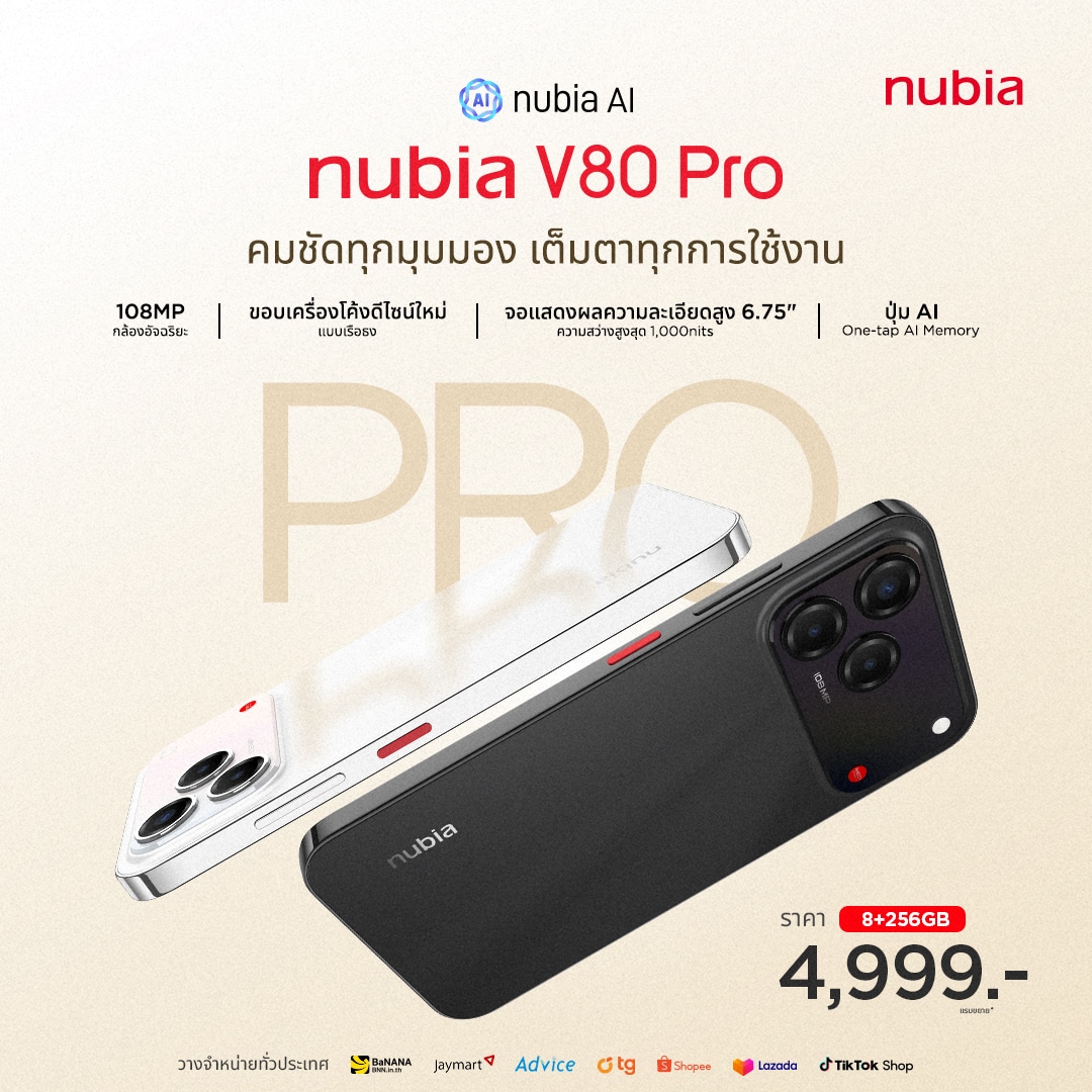 nubia V80 Series วางจำหน่ายให้ได้จับจองเป็นเจ้าของแล้ววันนี้ ผ่านตัวแทนจำหน่ายทั้งแบบออนไลน์ที่ nubia Thailand ของ Shopee, Lazada และหน้าร้าน Banana, TG Fone, Jaymart และ Advice ทั้ง 3 รุ่นจะได้รับประกันตัวเครื่องนาน 18 เดือนด้วยนะ สรุปราคาของแต่ละรุ่นให้อีกที ตามด้านล่างนี้เลย