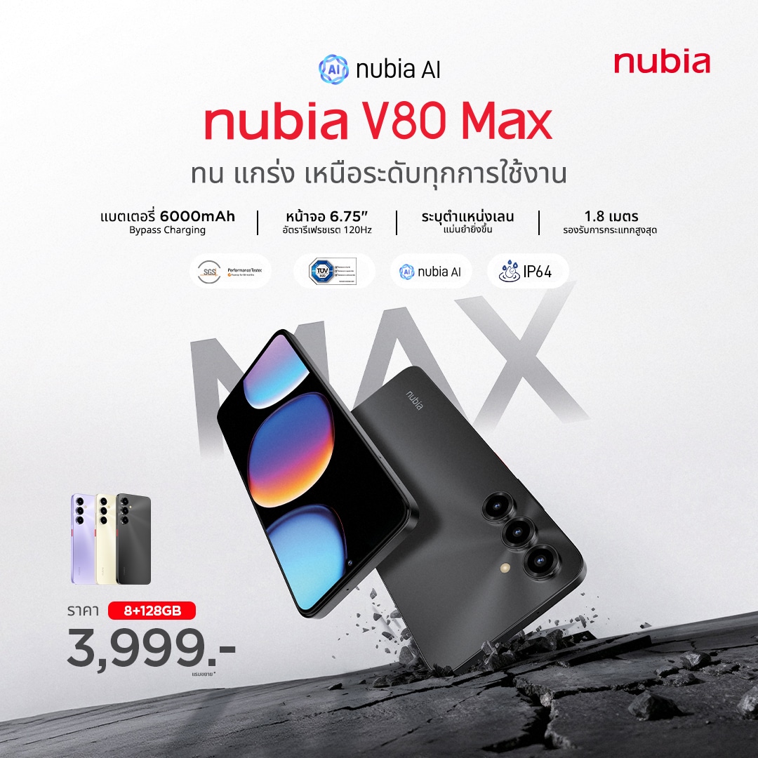 มาปิดท้ายกันที่ nubia V80 Max รุ่นน้องเล็กในแง่งบประมาณ แต่สเปคที่ให้มาก็ไม่ได้เล็กตาม เพราะชูมาด้วยจุดขาย “ทน แกร่ง เหนือระดับทุกการใช้งาน” เป็นมือถือสายอึด จอใหญ่ แบตฯอึด เครื่องถึก GPS แม่น ตัวจบในงบไม่ถึง 4,000 บาท สำหรับคนใช้งานหนัก!