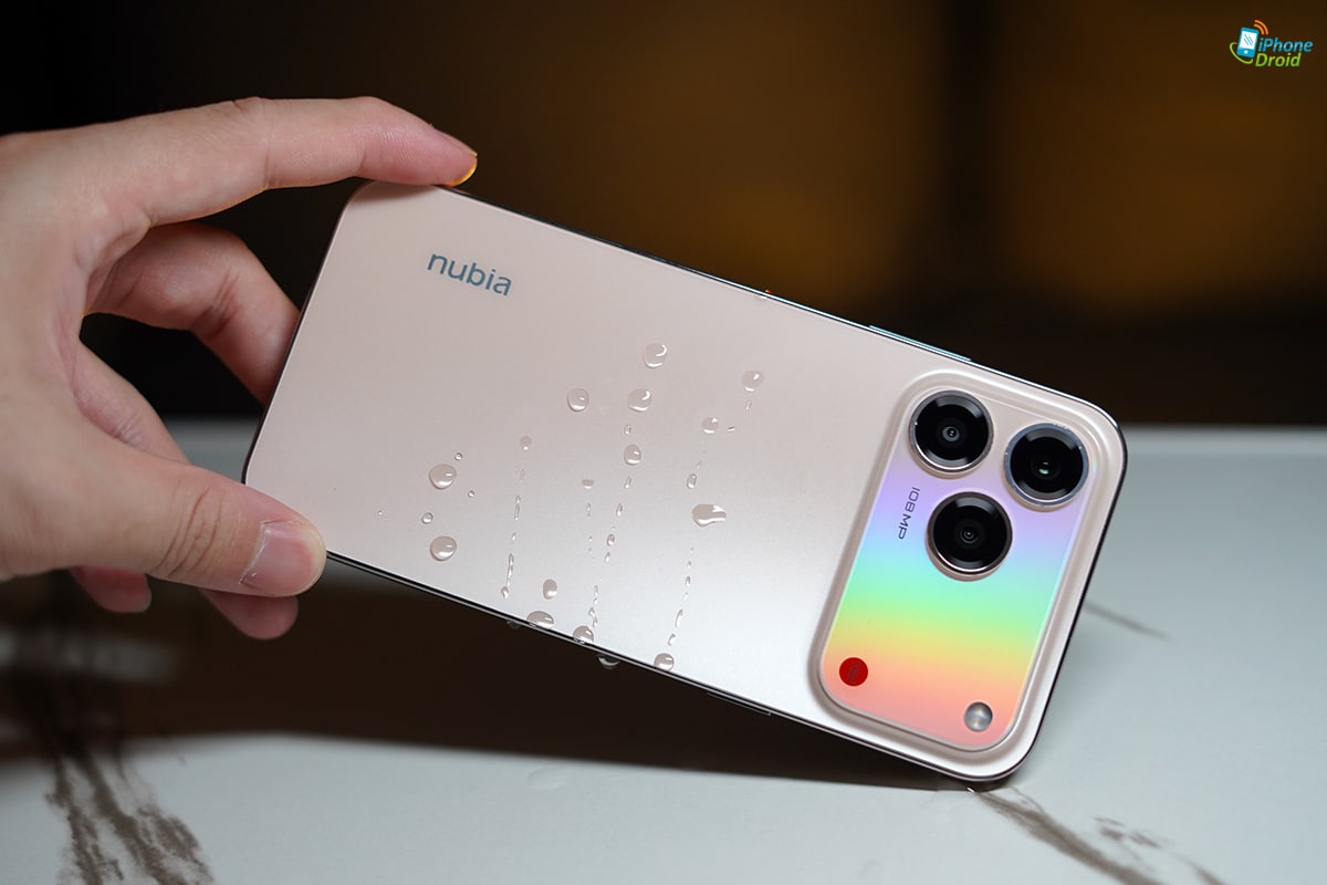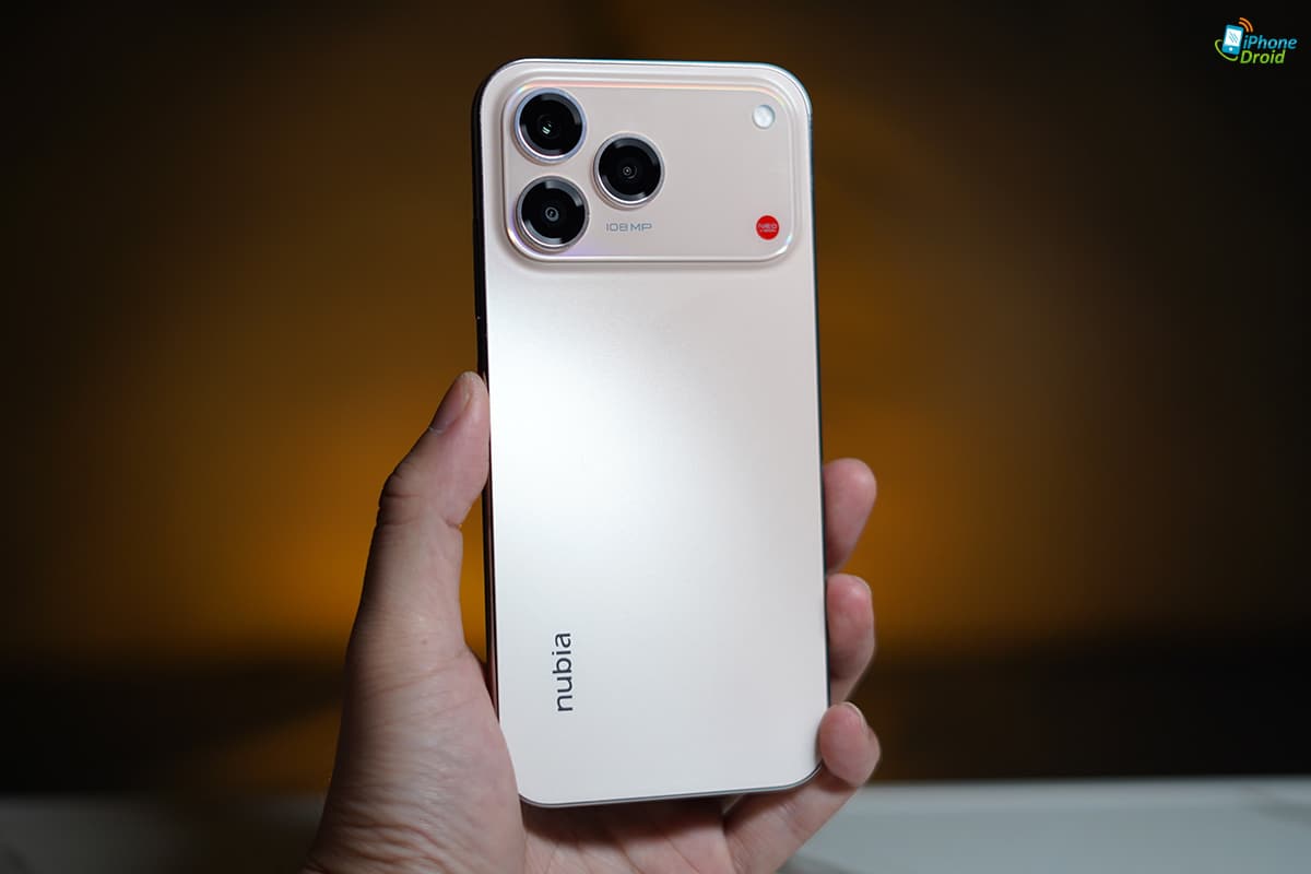 สีที่เราได้มาเป็นสี Petal Gold เป็นทองโทนอบอุ่นที่ดูพรีเมี่ยมเกินราคามาก ๆ ฝาหลังเป็นแบบผิวด้าน กรอบเครื่องมันวาวเพิ่มความหรู และรอบ ๆ ตัวเครื่องก็ยังมีรายละเอียดสีแดงที่เป็นสีของแบรนด์ nubia แทรกเข้ามาได้อย่างลงตัวอีกต่างหากครับ