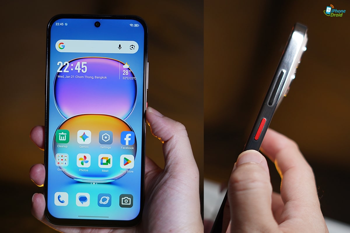 โดยรวมในเรื่องดีไซน์ของ nubia V80 Pro ก็ถือว่ามอบรูปลักษณ์ที่พรีเมี่ยมเอามาก ๆ ตั้งแต่ดีไซน์โค้งมนแบบเรือธง หน้าจอขนาดใหญ่ สว่างสูง อีกทั้งความเพรียวบางของดีไซน์ แต่ก็ยังแน่นหนาเมื่อได้จับถือ และที่ขาดไม่ได้คือสีทอง Petal Gold ที่ดูอบอุ่นแล้วเข้ากับดีไซน์นี้เป็นอย่างมาก พอรวมกันทั้งหมดก็ได้ความลงตัวอย่างแท้จริงเลยล่ะครับ