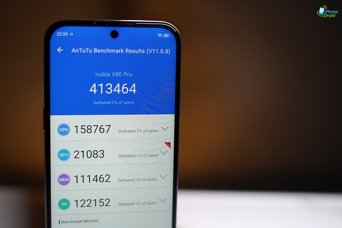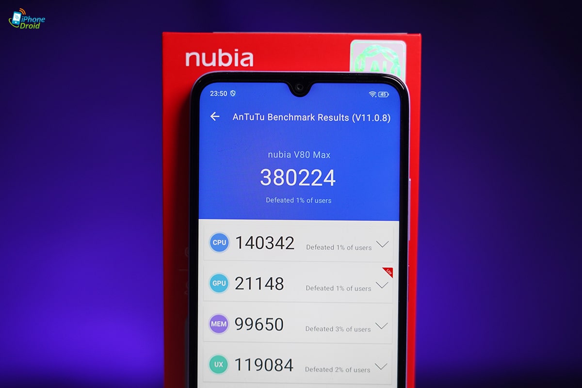 เพื่อให้เห็นภาพประสิทธิภาพคร่าว ๆ ของ nubia V80 Pro ที่ใช้ชิป Unisoc T7280 และ RAM ขยายรวมกัน 20GB แล้ว เราลองทดสอบกับแอป AnTuTu Benchmark มาให้ ได้คะแนนออกมาที่ 413464 คะแนน อาจจะไม่ได้สูงมากมาย แต่ก็ตามเรตราคาไม่ถึง 5,000 บาทล่ะเนอะ