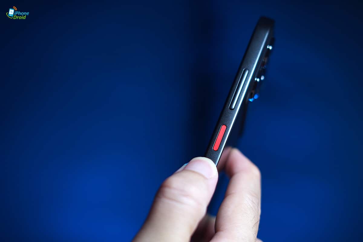 ส่วนปุ่ม Power จะอยู่ที่ฝั่งขวามือของตัวเครื่องเป็นปุ่มสีแดง ซึ่งภายในจะมีเซ็นเซอร์สแกนลายนิ้วมือมาให้เราแตะสแกนได้อย่างสะดวกอีกด้วยครับ